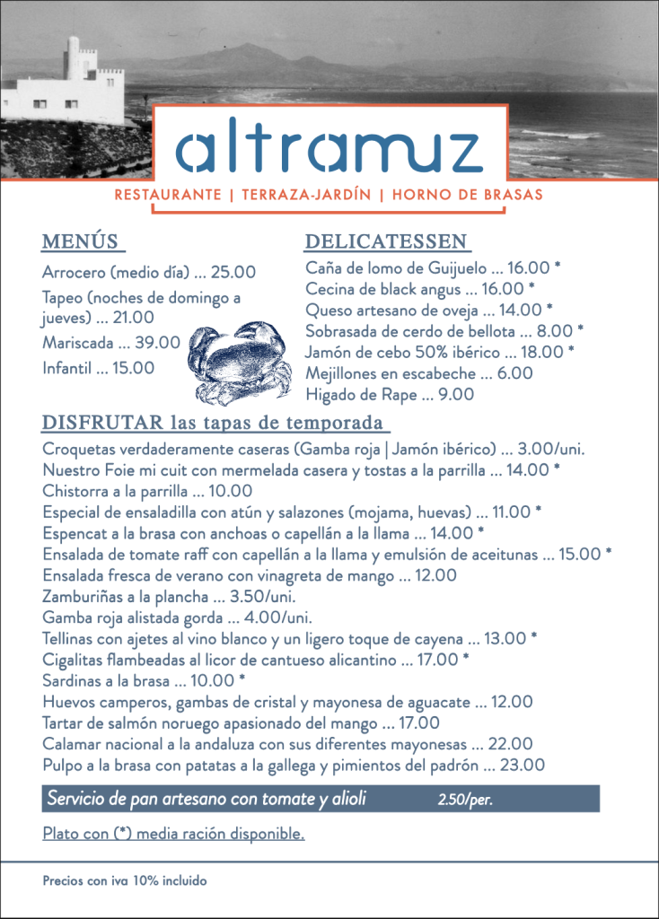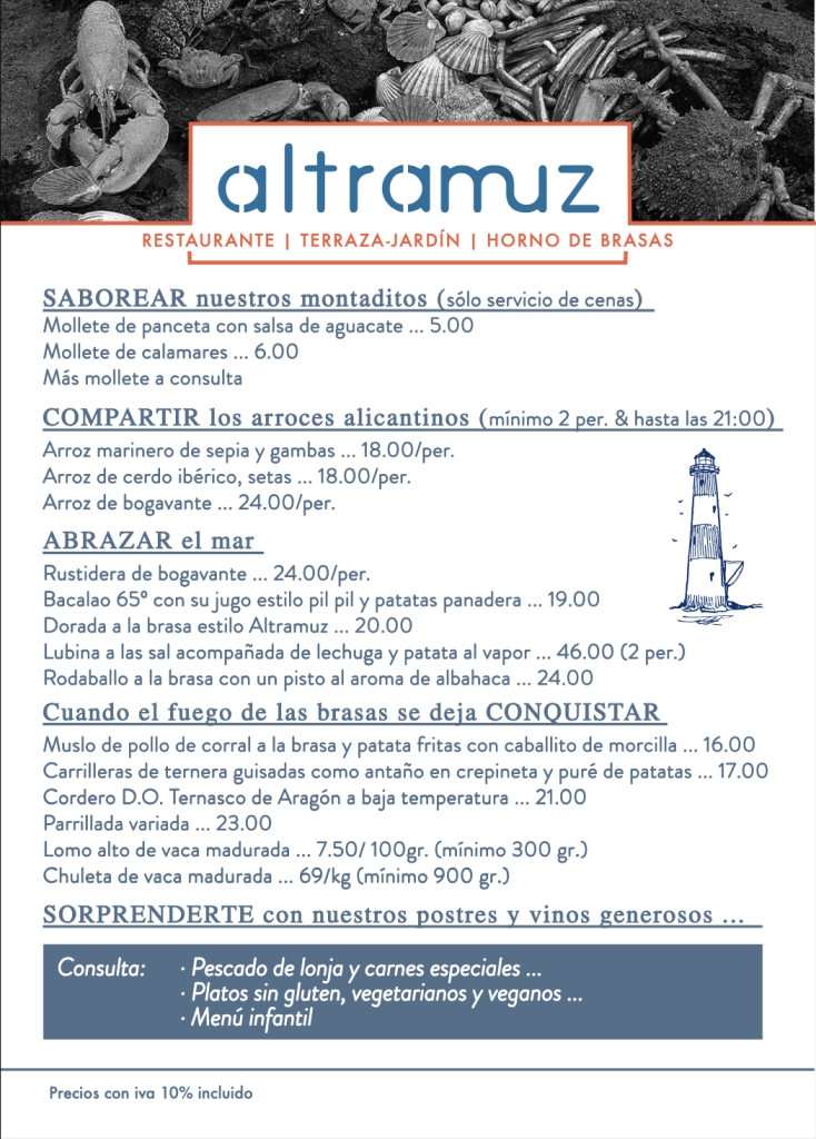 El restaurante Altramuz ofrece una cocina de mercado de máxima calidad, con producto seleccionado, y combinando las técnicas más actuales con lo tradicional, lo moderno con lo ancestral. De hecho, dos de los elementos más característicos de su cocina son el horno de leña y y la parrilla. Gracias a ellos, se recuperan las texturas, sabores y aromas de siempre en cada elaboración.